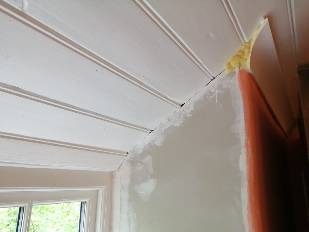 Inside the house I’ve spent a few evenings faffing around with the coving over the windows. It’s not an easy job with wonky walls and a slanting ceiling, but finally all the coving is attached, and will just need filling, and sanding and caulking…. Nearly there.