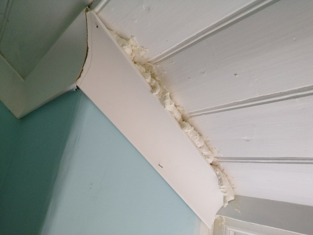 Above our bedroom door I filled, and sanded the plasterboard, before attaching the final piece of coving and filling and caulking around it.