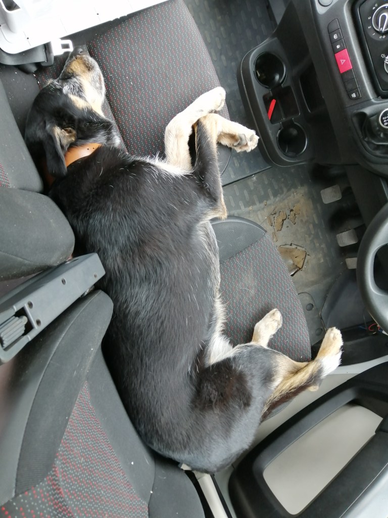 The dog has decided he doesn’t like leaving us unsupervised in the camper, so the compromise is he sleeps on the front seat while we work behind. It doesn’t look as comfortable as being asleep on the sofa, but at least it means he’s getting used to being in the van.