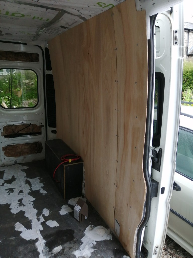 Now the van is insulated it’s time to make it look less like a van and more like somewhere you can live. Our first job was cutting and attaching thin sheets of plywood to the wall. We’re a little undecided whether to paint them or just varnish, so for now we’ve been as regular as possible with the screws to keep it looking tidy if we go with varnish. There are some some gaps between the boards, which will need filling. The one patch of wall we’ve left is the bathroom, which will need something more waterproof to line it.