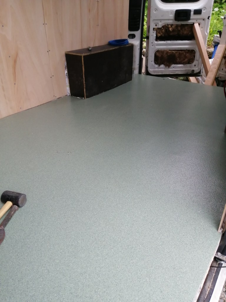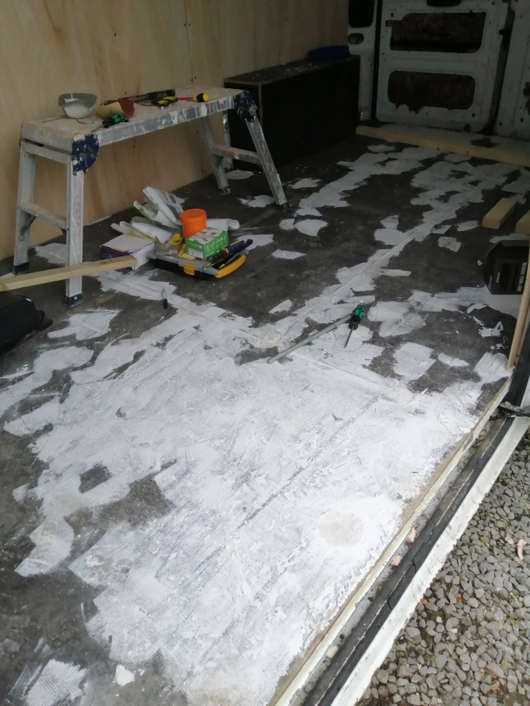 While Chris installed the electric hook up in the van side, I filled any holes or dips on the floor, before sanding it flat.