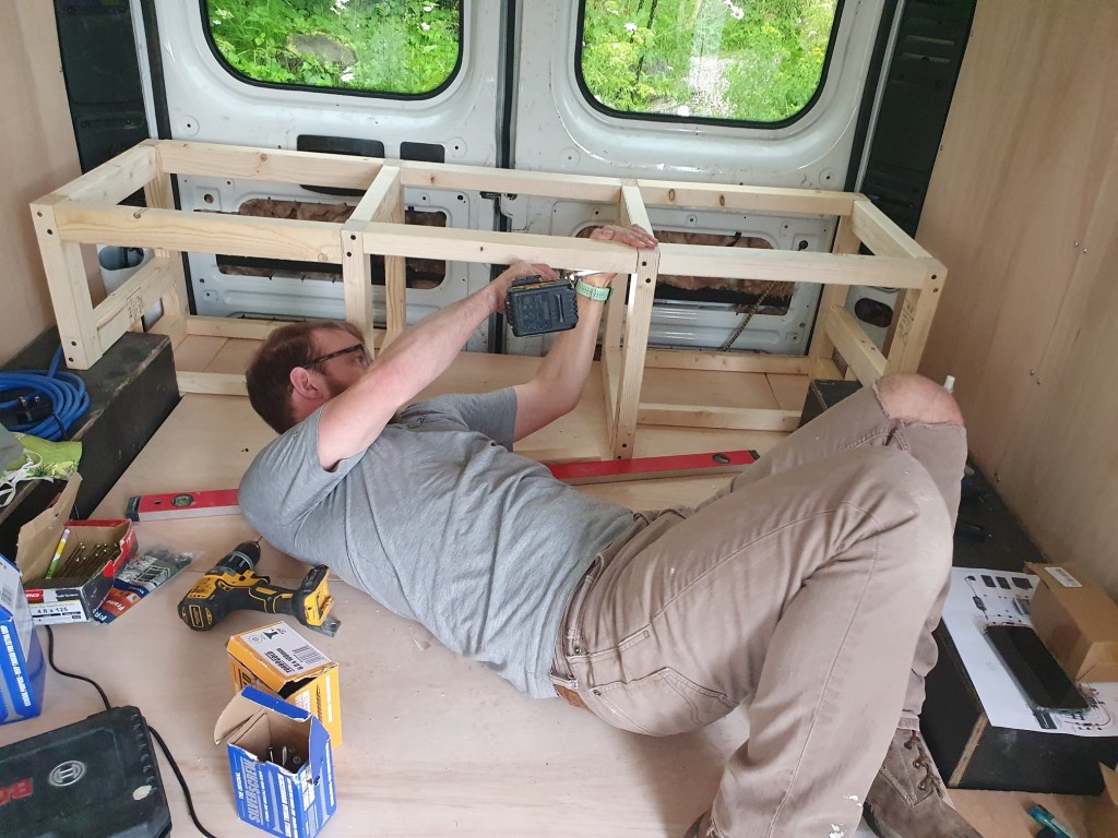 Out in the van it’s all similarly mathematical, as we moved on to building the bed frame. Chris has found a design online, which was fairly simple to follow. Still it took a long time cutting every piece and putting them together.