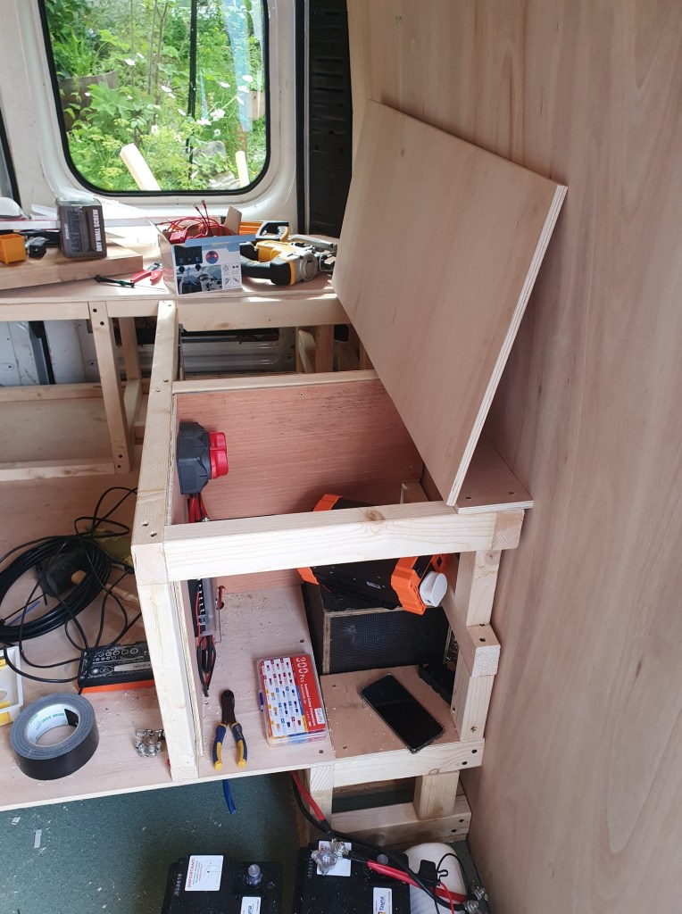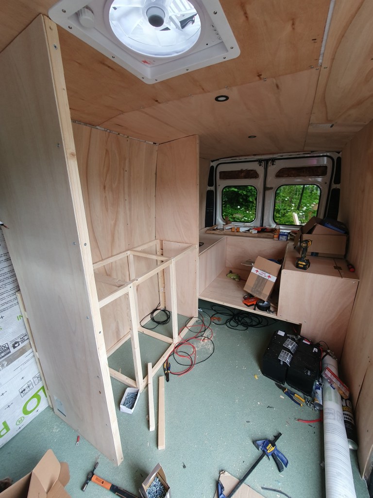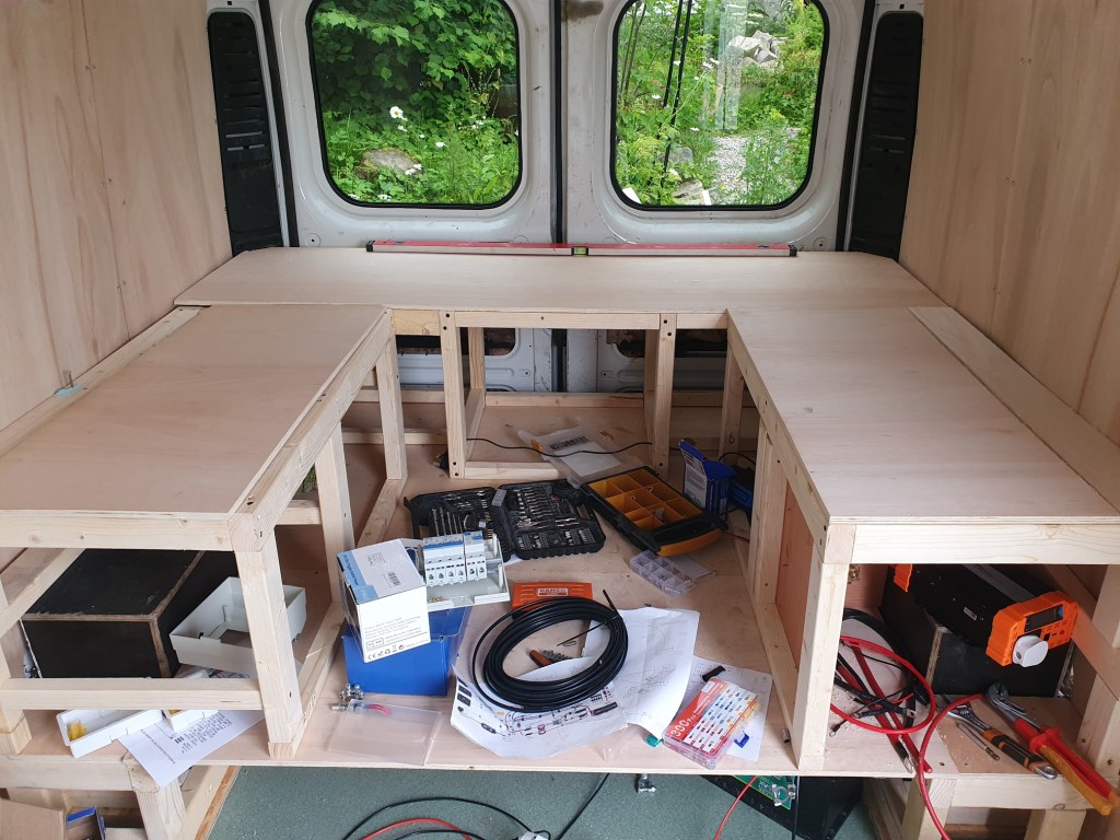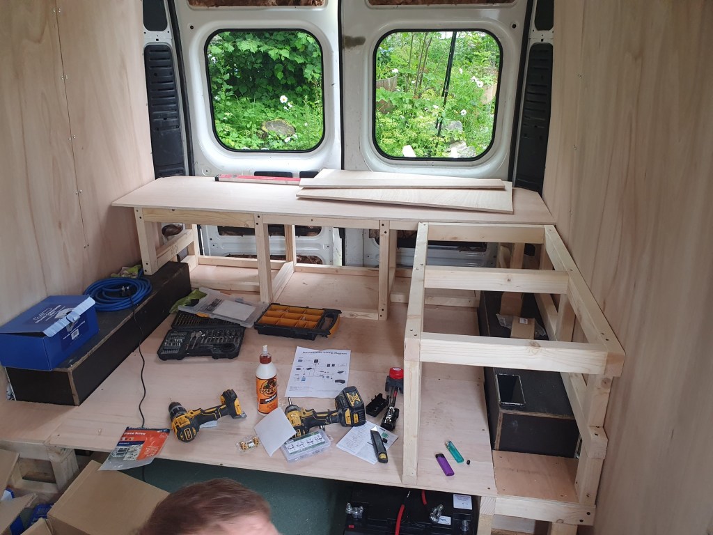 We then got on with building the storage. We’d decided to have a raised floor under the bed/benches for extra storage. To build this, Chris had found a design online and adjusted it to our needs. With thick plywood on top to act as a suspended floor we’ll next build benches on top, with a table that can convert into a bed. Sounds complicated.