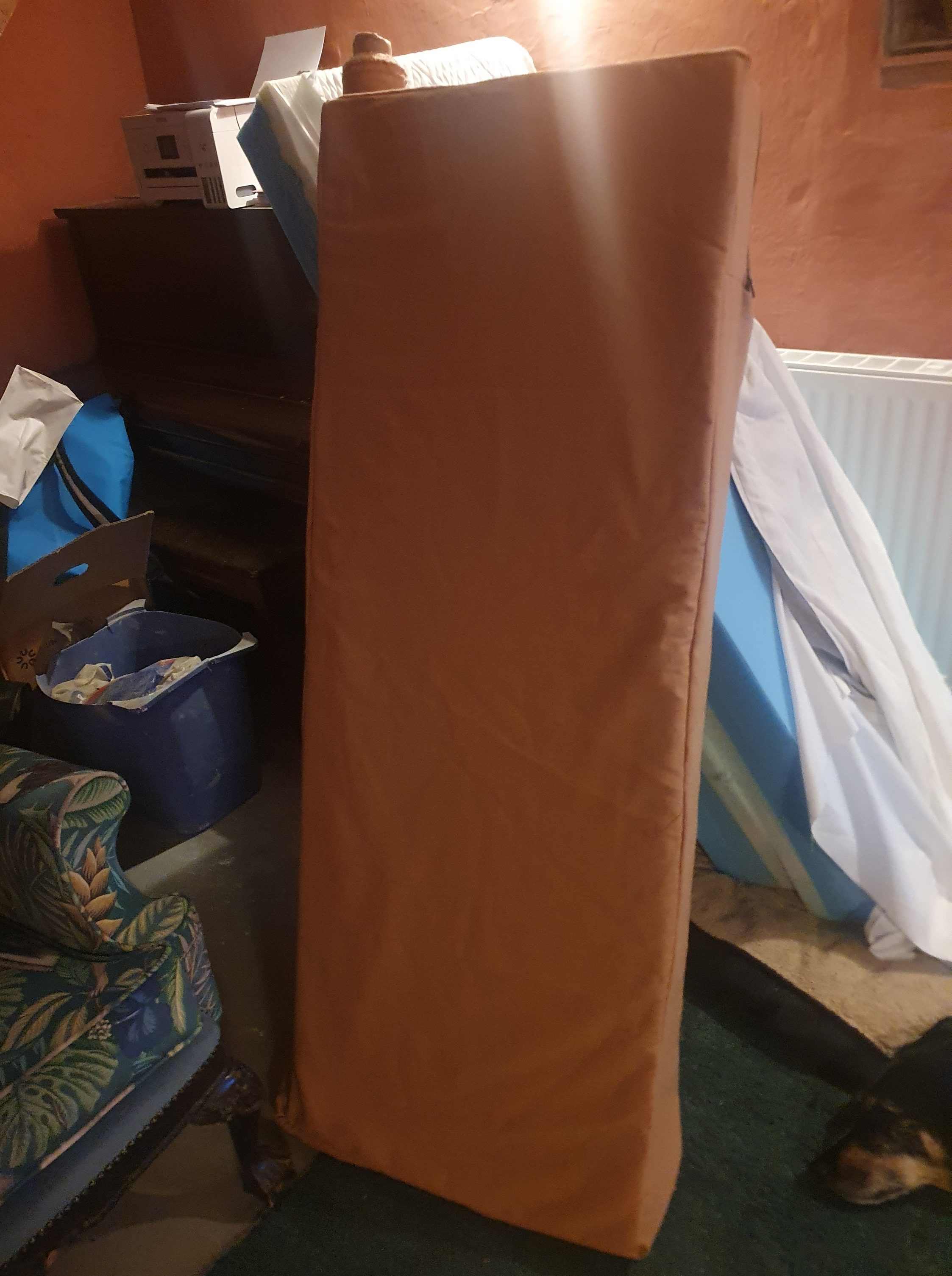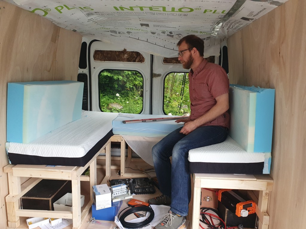 With the benches built, we cut down the mattress we’d bought into the right sizes, so they can be benches or a bed, when needed. Now these are all cut up my next evening job will be sewing the covers.