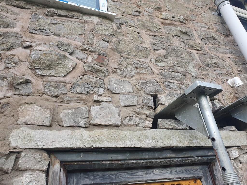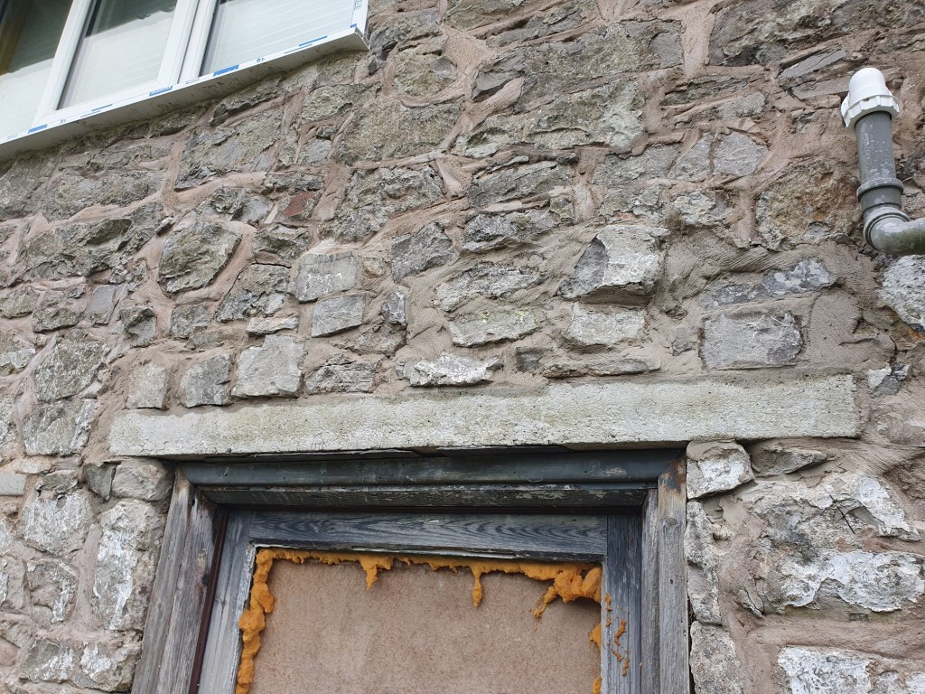 Chris and Max removed the old lintle over the back door, propping up the wall with acro props, and inserting the concrete lintle. Once in, Max was left to rebuild the wall above and mortar everything in place. The end result is seemless with the old wall.