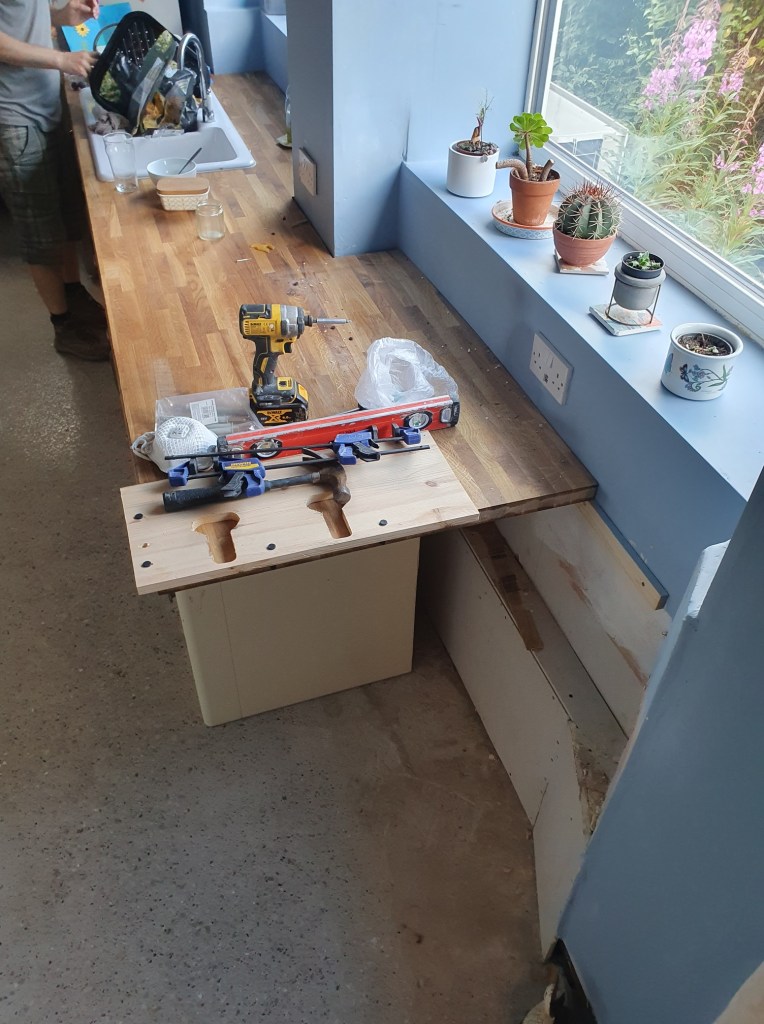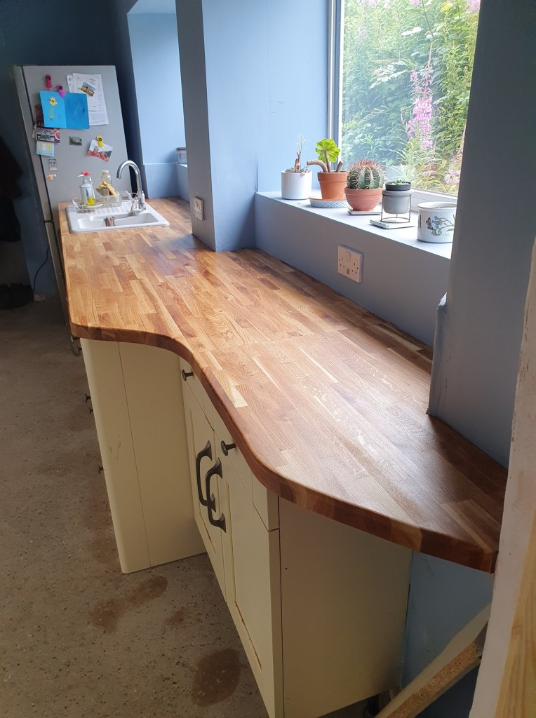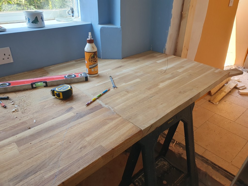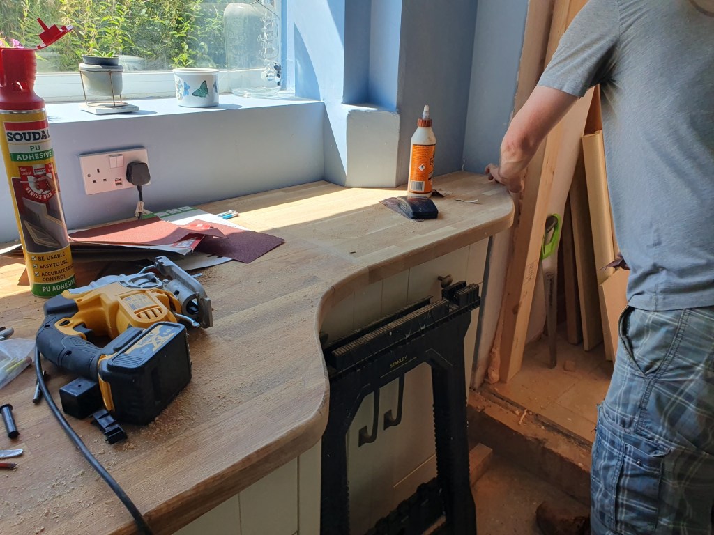 One particularly exciting job, was the shaping of the last bit of worktop. Chris had been putting it off because it was going to be so awkward and time consuming, but in the meantime we’d had to shuffle passed the worktop taking up half the doorway to the utility. Now it’s cut to follow the cupboards it opens up the space completely.