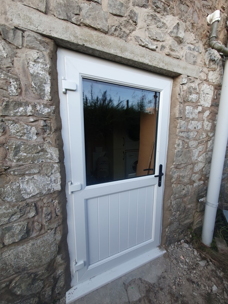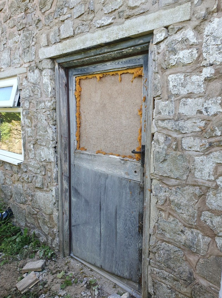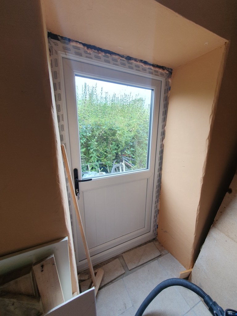 With the new lintle in and set, Max and Chris set about removing the old door. The frame of the back door was too rotten to save, so the whole thing had to be cut out. We’d bought a plain PVC door for this space, as it won’t be on display, as this will be our muddy boot room. Together, Max and Chris got the new door in and secured without too many issues.