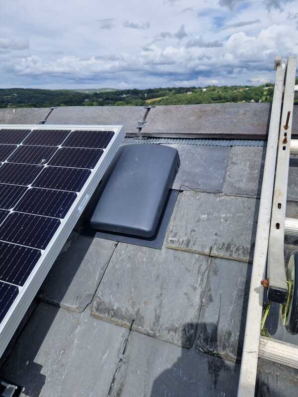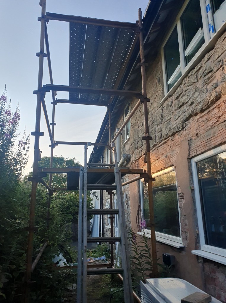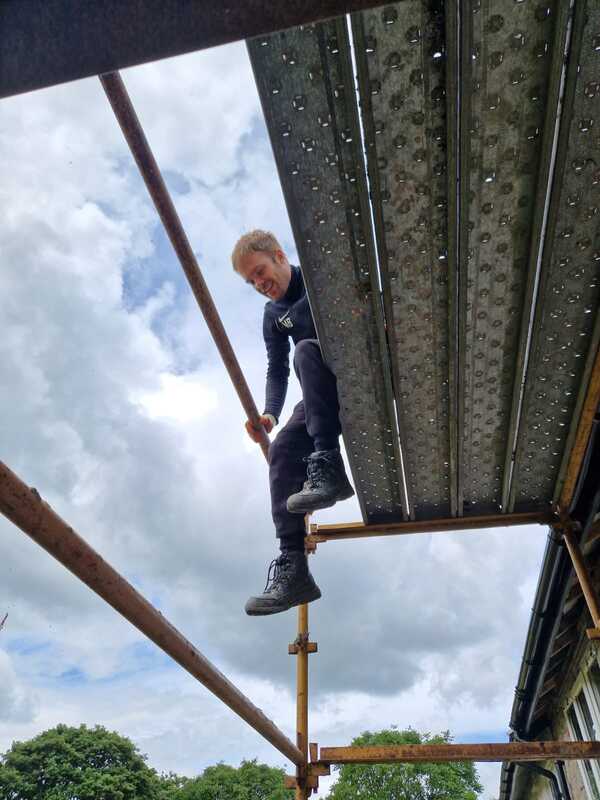 Chris and Max raised up the scaffolding up once again to install the external parts of our ventilation system.