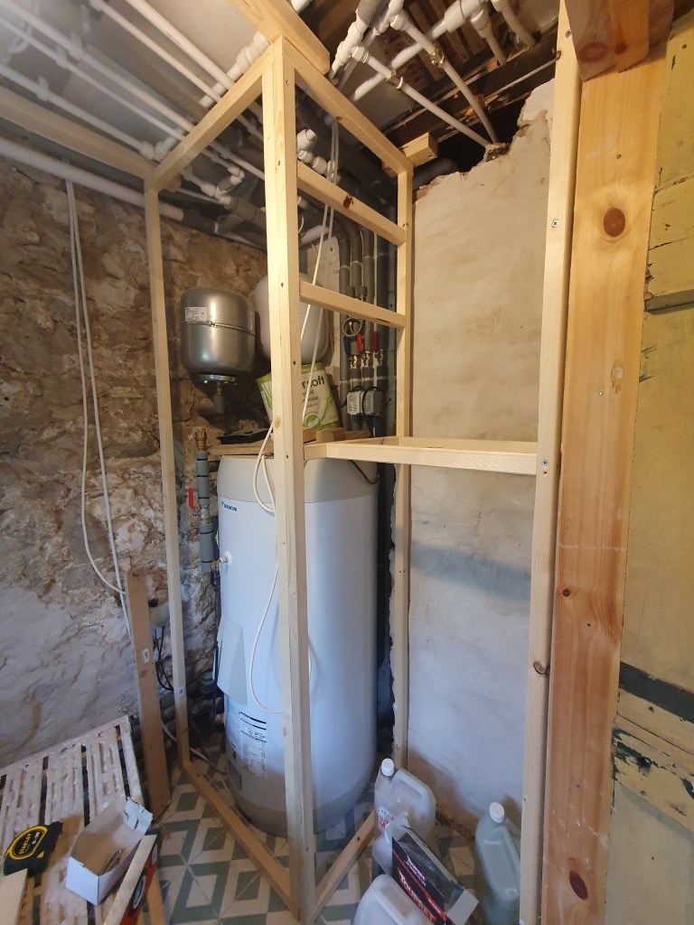 Another annoying job that we’d been avoiding was building the boxing round the boiler in the downstairs toilet. Awkward because of all the piping on the ceiling, and the fact that the beams were at different heights, and the floor has a slight slope towards the boiler. To provide stability to the boxing I started with the cupboard next to the boiler, setting shelves at approximately the right heights for our cleaning products. Still work to do but getting there.